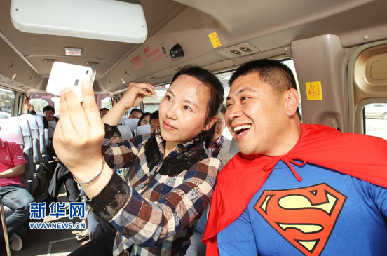4月22日,游客与身着超人服饰的景区交通车司机合影留念。(尹召功摄)