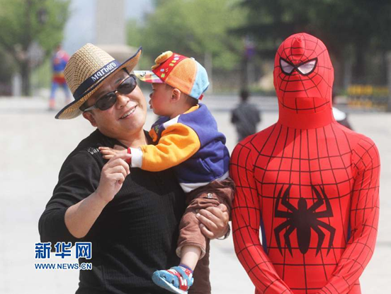 4月22日,游客与身着蜘蛛侠服饰的工作人员合影留念。(尹召功摄)