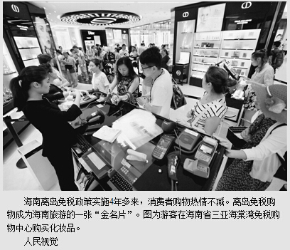2011年海南离岛免税店开业以来受到国内游客欢迎。目前,免税商品已由最初的21大类增至38大类,婴儿配方奶粉、浓缩咖啡、保健食品等都在免税范围内,并放宽香水、化妆品、手表等10种热销商品的数量限制。2015年三亚、海口两家免税店销售离岛免税品55.4亿元人民币。