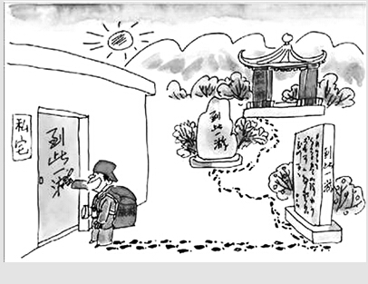 去年在蜀南竹海旅行,那里是翠竹的王国,各种竹子应有尽有。可是好端端的竹竿上,偏偏布满了游人用小刀刻划的字痕,歪歪扭扭的,特别刺眼。“某某到此一游”最为常见,也有刻上“某某我爱你一生一世的”,真不知道这样的游如何值得纪念,更不知道这样的“爱”怎么持续一生一世!随着竹竿的长大,那些字迹显得更加丑陋。它实际上把主人的名字,永远地刻在了耻辱柱上。