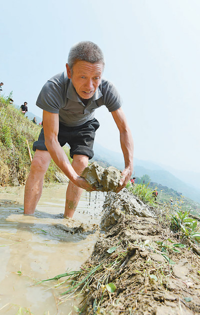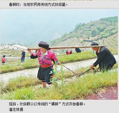 每年清明过后,春雨连绵,山溪奔流,山花烂漫之际,当地群众便开始了一年的春耕工作。龙胜县农业局局长杨玄敏介绍说,“在这里,你可以看到传统的扶田基、砍田坎、犁田、耙田、匀田、插秧等系列工序。” 据介绍,由于梯田狭小,耕牛难以行走,靠人拉犁的“耦耕”耕田方式在这里依然存留。