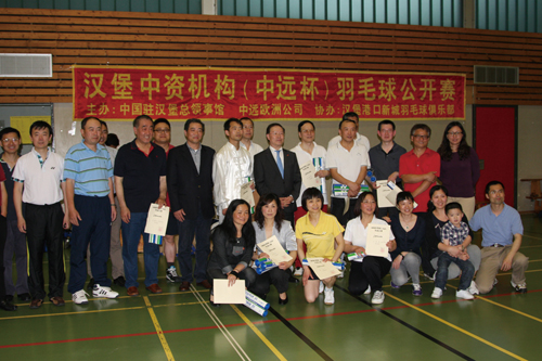 本刊讯:6月7日晚,汉堡首届中资机构(中远杯)羽毛球公开赛顺利举行。本次活动由驻汉堡总领馆、中远欧洲公司主办,汉堡港口新城羽毛球俱乐部协办。领区约20家中资机构参与,其中参赛选手40余人,到场观众60余人。