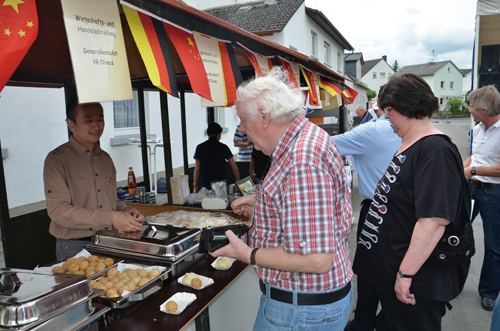 中国驻法兰克福总领馆经商室搭建的“中国风”展台成为此次活动的亮点之一,吸引很多市民驻足。在这个中国文化的展台中,市民可以品尝到麻团、包子、炒面、茶等中国美食,还可以参与“中国文化问答游戏”赢取礼品。展台上展示的用德语介绍中国建筑、京剧、文化的书籍和京剧脸谱、中国剪纸、中国丝绸等装饰品,深受德国市民的喜爱。