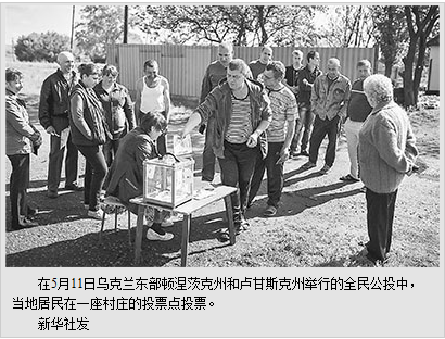 5月11日,乌克兰东部要求独立的顿涅茨克州和卢甘斯克州的730万人于当地时间8时开始投票,决定是否独立。截至本报记者发稿时,卢甘斯克州选举委员会称投票率已经将近80%,顿涅茨克州选举委员会称其投票率将近70%,计票结果将于12日正式公布。乌克兰外交部11日发表声明称,公投结果对乌克兰领土完整和国家体制不会有法律影响。乌克兰总统办公厅代主任谢尔盖·帕申斯基表示,在东部地区进行的“反恐行动”进入最后阶段,并取得一定成果。分析认为,“地区公投”不能解决乌克兰危机,只有各方真心对话,才能找到和平出路。