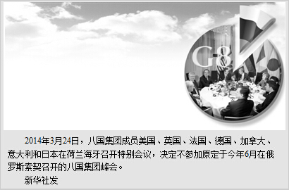 布鲁斯·琼斯:西方七国不参加索契峰会,就意味着俄罗斯被排除在八国集团之外了。即使乌克兰危机平复,在普京任期内,七国集团也很难再次接受俄罗斯。
