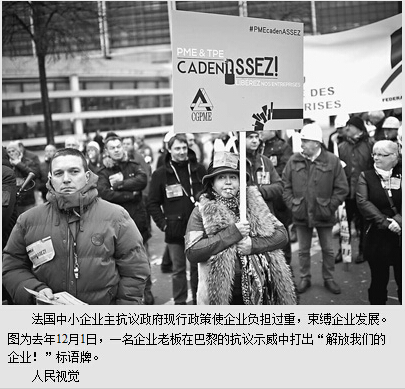 外部因素无法给予法国经济正面影响,而法国经济本身也缺乏活力。2014年法国失业率一路攀升将近10%,5个年轻人中就有1个没有工作,大批企业倒闭,众多中小企业难以为继,经济活力无法释放,家庭开支在减少,商店打折促销成为常态,巴黎圣母院所接纳的善款都随之缩水,以至于无法购买圣诞树过节。有调查显示,法国人的悲观情绪在2014年度直线上升,总统奥朗德的支持率也跌至法国第五共和国以来最低。