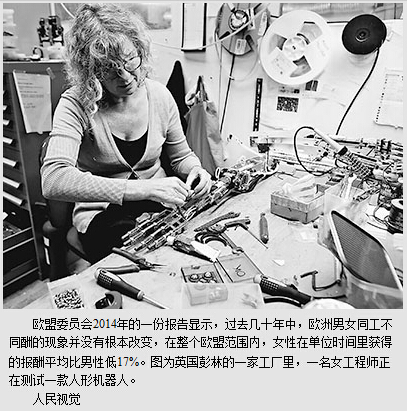 在欧洲,“男女应该同工同酬”的规定早在1957年就写入《罗马条约》。然而直到今天,男女薪酬不平等的问题在欧洲仍然普遍存在。欧盟委员会2014年发布的一份报告指出,在整个欧盟范围内,女性在单位时间里的工作报酬平均比男性低17%。