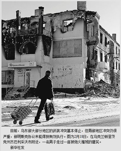 俄罗斯、德国、法国和乌克兰四国领导人2月12日在白俄罗斯首都明斯克就长期政治解决乌克兰危机的综合性措施及乌东部地区停火问题达成协议。协议内容包括自15日零时起在乌东部实施全面停火、冲突双方不迟于停火后第二天开始撤出重型武器,建立安全区等。可以说,停火实施一周多以来,部分实现了和平,乌东部民间武装表示顿涅茨克市内只有零星枪声,食物和水源供应正常。此外,乌政府军与民间武装之间还进行了战俘交换,缓和了双方对立局势。