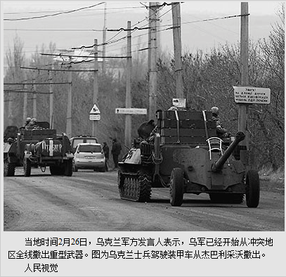 2月26日,乌克兰军方发言人斯杰利马赫在新闻发布会上表示,乌军已经开始从冲突地区全线撤出重型武器。当天早些时候,乌军总参谋部在国防部网站发布通告说,为履行本月12日达成的明斯克协议,乌政府军将于26日开始撤出口径100毫米以上的火炮。乌东部民间武装指挥官巴苏林也在26日表示,民间武装已经在欧安组织代表监督下撤出了榴弹炮等武器,并将于27日开始撤出“冰雹”火箭炮。