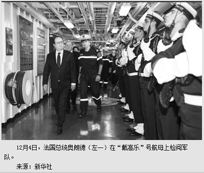 当地时间12月4日,法国总统奥朗德登上正在叙利亚附近地中海海域执行打击“伊斯兰国”任务的“戴高乐”号航空母舰,为参战士兵鼓舞士气,并宣布在未来几天,“戴高乐”号将抵达海湾地区。