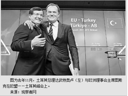 对于过去一年深陷难民之苦的欧盟来说,土耳其似乎已成为其目前唯一能够抓住的“救命稻草”。自去年下半年起,欧盟方面就已多次向土耳其伸出“橄榄枝”,寻求合作可能。去年10月,德国总理默克尔在访问土耳其时表示,愿意协助加快土耳其加入欧盟的谈判进程,以期在难民问题上与土耳其加强合作。本月初,图斯克在土耳其之行中也不乏“示好”之意。