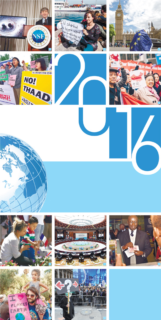 英国选择脱离欧盟、特朗普当选美国总统,国际政治池塘中飞出两只“黑天鹅”;欧洲极右翼政党支持率攀升、民粹思潮抬头,全球化遭遇前所未有的挑战;恐怖主义与反恐的拉锯战仍在继续,世界需要新的反恐思维;东北亚安全局势愈益偏离和平发展轨道,国际社会严重担忧。