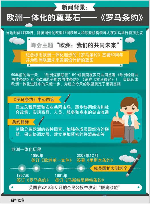 3月25日,除英国以外的欧盟27个成员国的领导人和欧盟机构领导人,在意大利首都罗马召开特别峰会,纪念《罗马条约》签署60周年,并于会后签署《罗马宣言》,为欧盟未来10年的发展规划蓝图。