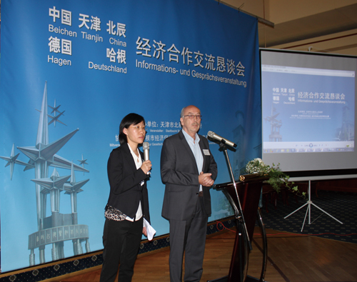 首席行政长官许密德博士、哈根经济促进、城市形象及旅游事务署总裁希瑟尔(Schiesser)先生发表了致辞。许密德先生说,中国快速发展的经济、巨大的市场,紧紧地吸引着哈根市及周边地区的企业。他相信,恳谈会将推动哈根市及北辰区的经济发展,造福民众。