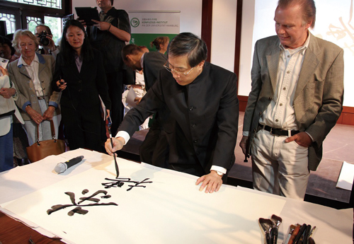 汉堡大学孔子学院德方院长康易清博士(DrCarstenKrause)首先致欢迎词。他介绍了汉大孔子学院自2007年成立以来,在中德文化交流方面所做的大量工作。今年5月底中德双方政府共同开启了“中德语言年”活动,“唱”、“写”、“说”是孔子学院的口号,上海书法家们的到来,海派书法展的举办,成为“中德语言年”活动的高潮之一。希望通过书法展示活动,促进两国的文化交流。