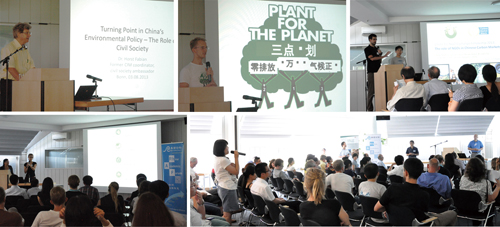 科隆大学的邵亚平教授给与会者带来了《粉尘和雾霾》(DustandBrownHaze)的讲座。邵教授以科技工作者的周密和严谨从空气污染物的种类、组成、来源、空气溶胶的形成过程开始给观众科普。邵教授指出不同组成的空气污染物经过成核,聚集,凝聚过程最终形成可以肉眼可见的粉尘或者雾霾。粉尘、雾霾中的PM2.5颗粒由于其体积小,直接入肺,有致癌性等特点对人体危害最大,已做为衡量空气污染的重要指标,备受热议。伴随中国现代化进程的高能耗,汽车大量使用造成了空气质量的严重滑坡,治理空气污染迫在眉睫,势在必行。至于如何解决粉尘和雾霾的污染问题,邵教授借鉴德国鲁尔工业区的成功环境改革提出了几点建议:诸如立法支持提高能源效率、推动清洁生产;转变我国以煤炭为主的能源结构,寻找再生能源;大力开发清洁的风能、太阳能;研究推广新技术。邵教授多次强调要促进公众环境自我意识的觉醒,倡导人人为环境,低碳生活的理念。邵教授的讲座诙谐而生动,时时引发全场的笑声。之后观众提问不断,气氛非常热烈。有观众尖锐的提出发达国家转嫁工业污染到不发达国家问题,也引发了参会者热烈的讨论。来自中德NGO组织的专家为与会者介绍了双边环保丰富多彩的交流项目,展示了交流成果。来自绿色浙江环保组织的褚旭珉先生和来自CarbonMarketWatch的DiegoMartinezSchütt先生为与会者带来了关于《中国碳交易试行》(China'scarbontradingpilots)的报告。碳交易是21世纪倡导二氧化碳减排新时代的市场产物。碳排放许可量和减排量都作为被买卖对象在碳交易市场流通。但是在带来巨大商机的同时,碳交易存在滋养租赁腐败、金钱利益大于环境利益等隐患。这就需要不涉及经济、政治利益的独立第三方对碳交易市场进行监管。如CarbonMarketWatch这样的组织不仅监察碳交易,还联合其他NGO组织发出自己的声音以影响环保政策的制定,抵制有损环境的项目。2007年以前中国没有碳交易市场,碳减排都是通过强制性的命令减排。今年才刚刚成立了北京、上海、深圳、湖北等7个碳排放交易试点。CarbonMarketWatch将协助绿色浙江发动NGO组织、高校和研究所一起监督这些试点碳交易,提高公众对碳交易的认识;指导试点碳交易向有利环保的正确方向发展,联合中国民间力量促成中国形成自己的碳交易监督网络。