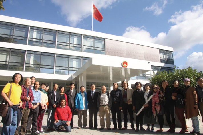 本刊讯近日,来自四川成都画院的14名艺术家在德国杜塞尔多夫举办主题为“成都艺术五洲行,走进德意志”画展。本次画展取得了良好的效果,画展期间中德观众络绎不绝,成都画院的画家们通过与德国画家的艺术交流以及在各地的参观访问汲取了许多新的艺术灵感。成都画院艺术家代表团还应邀到驻法兰克福总领馆做客,中国驻法兰克福温振顺总领事热烈欢迎成都画院叶瑞琨副院长一行到总领馆做客。他再次就此次成都画院14位艺术家到北威州杜塞尔多夫市举办“成都艺术五洲行,走进德意志”画展表示祝贺。他说,随着中国综合国力的增强,中华文化“走出去”是提升国家文化软实力的重要举措。此次成都画院来德办展就是很好的对外文化交流形式,总领馆愿意继续对德国德中艺术设计交流协会和成都画院今后举办各种形式的文化交流活动提供协助。温总领事还向代表团展示和介绍了馆藏书画和工艺作品,受到艺术家的好评。图为成都画院代表团在我驻法兰克福总领事馆办公楼前合影留念。