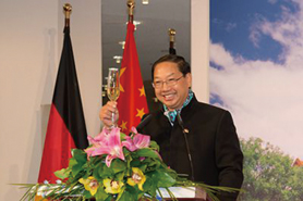 本刊讯2013年9月26日晚,中国驻德国大使史明德和夫人徐静华在使馆举办国庆64周年招待会。德国联邦交通、建设和城市发展部部长拉姆绍尔、外交部国秘哈贝尔等政要和联邦议员、社会各界人士以及外国驻德使节近600人出席。图为出席纪念大会的中外来宾共同举杯祝贺国庆64周年。