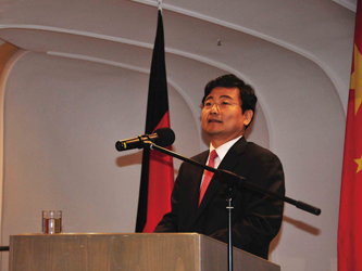 图为中国驻慕尼黑总领事馆朱万金总领事在国庆64周年招待会上致辞。