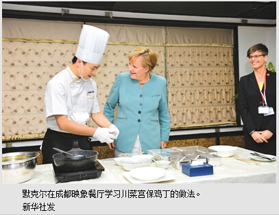亲自到菜市场采购郫县豆瓣、海椒面、八角香料,跟川菜大厨学做“宫保鸡丁”……7月6日,德国总理默克尔的成都之行颇为“另类”。虽然在国内外领导人中,明确表达出喜欢川菜的不在少数,但默克尔表现出了比其他人更大的热情,亲身体验了成都美食的真正魅力。随着全球媒体的文字和镜头,默克尔为成都美食做了个大广告,让国际社会刮起一股强劲的“成都美食风”。
