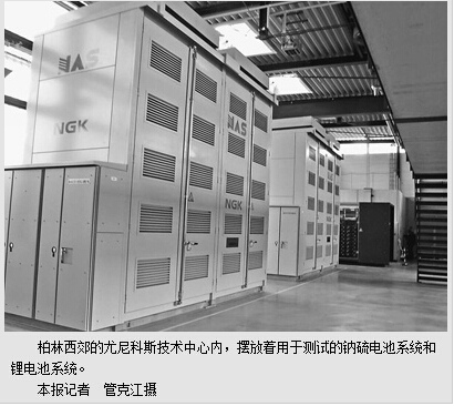 记者参观了尤尼科斯公司在柏林西郊建造的技术中心,这里集成了1000千瓦到6000千瓦的高能钠硫电池系统、200千瓦的高效锂电池系统、兆瓦级智能转换系统、太阳能和风能模拟系统,以及1000千瓦的储能电池柴油发电机系统,用于研发和测试电池储存管理软件。德国联邦外贸与投资署专家安娜·布罗伊蒂加姆表示,把这么多的可再生能源系统都集纳在同一个屋檐下测试,这样的技术中心在世界上也是少见的。据介绍,尤尼科斯已在德美英等国建成了20多家电池发电厂。