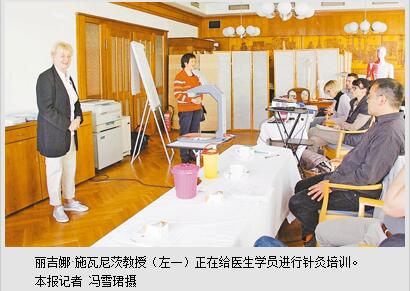 “我觉得,我们应该称‘中医’而不再使用‘传统中医’的翻译方法。因为中医是一门随着时代不断发展完善的医学,而不总是停留在过去的经验。”讲台上,丽吉娜·施瓦尼茨精神饱满,向台下15名从德国各地慕名前来的医生,传授中医针灸知识。