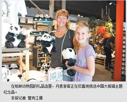 在柏林动物园的礼品店里,早已摆满了各种熊猫相关纪念品:熊猫T恤衫、熊猫茶叶罐、熊猫折扇……来自丹麦的游客约翰逊带着女儿正在挑选纪念品。7月6日起,大熊猫馆将对公众正式开放。“梦梦”和“娇庆”将可以到室外活动,和民众亲密“接触”。柏林市民安格丽卡一说起大熊猫,脸上满是幸福和喜悦,她希望“梦梦”和“娇庆”能早日结下中德友谊的果实,相信“明天的柏林动物园一定会因为它们而被挤爆。”