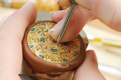 我们在参观中注意到,为符合日内瓦印记“12条军规”的要求,技师们将底盘和所有齿轮传动环边都打磨出一个45度的斜面,以确保部件结合部位更加顺滑。按照规定,如果厚度相当或小于 0.15毫米的齿轮,允许只削角打磨一面;如果齿轮厚度大于 0.15毫米,则齿轮的两面都必须做削角打磨处理。而对0.15毫米厚的齿轮进行磨边处理,已非肉眼所能及,技师们必须在显微镜下进行全手工微观操作。除此之外,技师们还要对其进行抛光处理,以保证所有部件如镜面般光亮,连细小的螺丝头不会放过,都要经过打磨修圆的过程。在打磨车间里,一位正在为一款机芯底盘打磨珠状装饰的技师停下来给我们进行解说。据他介绍,机芯底盘的两面都要打磨装饰。通过改变不同形状的磨针,可以磨出7个大小不同的印记,而这一装饰工作主要是出于美观上考虑。事实上,需要装饰的还远不止于底盘一处,甚至连一个要用镊子才能拿起来的小部件也要进行同样的装饰。因为完全由手工来操作完成,从这个意义上讲,每一个腕表都可称得上独一无二。