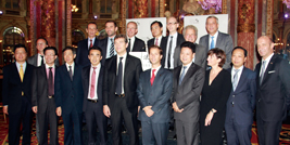 法国生产振兴部长蒙特布尔、前文化部长Renaud Donnedieu de Vabre、俱乐部主席帕里索、达索集团首席执行官洛朗·达索及家乐福等著名企业总裁与欧华集团总裁黄学胜、华为法国公司总经理王业明、贸促会驻法首代严炬奋以及进出口银行、工商银行负责人在酒会上合影。