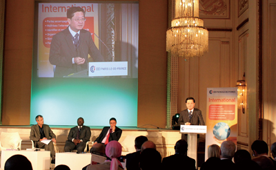 日前,法非委员会和法国商校HEC在巴黎工商会举行“中法非创新合作论坛”,探讨在新形势下,中国、法国与非洲的新型经贸合作关系。图为法国中资企业协会会长、中国银行巴黎分行行长潘诺在论坛上发表演讲,介绍该行与非洲同业的金融合作,以及为促进中法、中非经贸往来与合作发挥的桥梁和纽带作用。