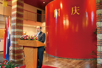本刊海牙讯林斌九月的荷兰,金风送爽,秋意渐浓。在欢度中秋、喜迎国庆的热烈气氛中,中国驻荷兰大使陈旭于26日下午在使馆举行招待会,隆重庆祝中华人民共和国成立64周年。荷兰议会和政府各部门政要、社会各界友好人士、各国驻荷使节、禁化武组织和国际司法机构负责人、华侨华人、留学生和中资机构代表、在荷中国籍国际职员等400余人出席了招待会。