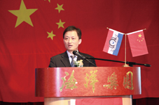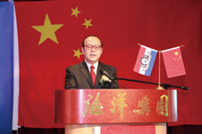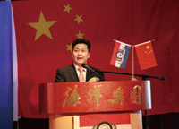 图为中国驻荷兰大使陈旭在荷兰青田同乡会成立30周年暨中国梦海外青田论坛会上发表贺辞。(摄影张亮)