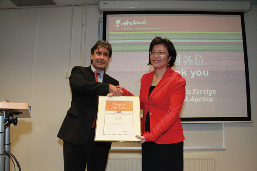 致辞后,BasPulles代表荷兰经济部及荷兰外商投资局向中检集团欧洲有限公司总经理暨中资企业协会主席李敏燕女士颁发了2013年度InvestmentAward(荷兰经贸使者奖),以表彰她在发展本企业的同时,积极推进中荷双边经贸往来所作出的贡献。李敏燕在接受颁奖后表示“这一奖项是对中检集团欧洲公司的肯定,更是对所有在荷兰发展的中资企业家的肯定。”李敏燕女士还在她的致辞中详细介绍了荷兰中资企业的发展成果,并让大家分享了关于如何获得和把握机遇的相关经验。图片001-图为荷兰经济部外商投资局局长巴斯.普勒斯向中检集团欧洲有限公司总经理暨中资企业协会主席李敏燕女士颁发了2013年度Investment Award(荷兰经贸使者奖),