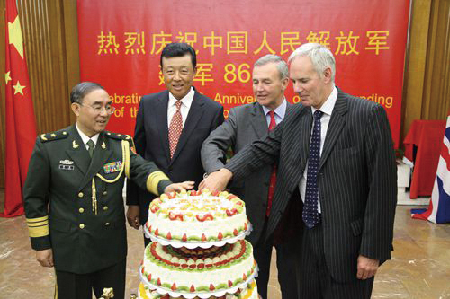 本刊讯7月29日晚,中国驻英国大使馆国防武官蔡勇少将在使馆举行招待会,隆重庆祝中国人民解放军建军86周年。刘晓明大使和夫人胡平华率使馆主要外交官出席。英国国防参谋长尼古拉斯·霍顿上将、空军参谋长安德鲁·普尔弗德上将、议会上院议员霍维尔勋爵、韦斯特男爵、国防副参谋长埃弗拉德中将、皇家国防研究院院长戴维·比尔中将、空军友善基金尼古拉斯中将等高级将领、议员和官员、英各界友好人士、各国驻英武官、中资机构及华人华侨代表等200多人参加招待会。