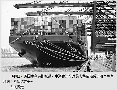 全球最大的集装箱船——“中海环球”号,在停靠英国港口费利克斯托港三天后于1月10日前往荷兰鹿特丹。英国《泰晤士报》评论称,“中海环球”这艘海上“巨无霸”的到来进一步推动了英中贸易往来和发展,它把更多的中国商品带到英国,同时也为英国的出口商创造了接近中国和亚洲市场的难得机遇。英国媒体认为,“中海环球”号仿佛一扇窗口,透过它,人们可以看到英中贸易快速发展的可喜景象。