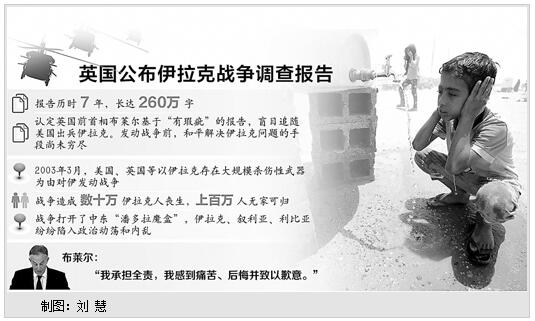经过长达7年的调查,英国官方组建的伊拉克战争调查委员会6日公布调查报告。这份长达260万字的调查报告认为,英国作出伊拉克战争的决策是基于“有瑕疵”的情报和评估,在发动战争之前,解决伊拉克问题的和平手段并未穷尽,军事行动并非当时万不得已的手段。报告指出,发动伊拉克战争的决定不正当,时任英国首相布莱尔对伊战负有不可推卸的责任。