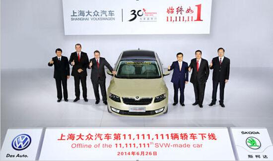 2014年6月26日,随着一辆流光金Octavia全新明锐缓缓驶下生产线,上海大众汽车迎来了第11,111,111辆轿车的下线。继2013年11月成为国内首家产量突破千万辆的轿车生产企业后,上海大众汽车再次刷新国内乘用车行业记录,为企业30周年献上厚礼。而11,111,111这组特别的数字,也书写着上海大众汽车30年来在技术创新、质量领先、用心服务、践行企业社会责任等各个领域的坚持与成就。在追求卓越的道路上,上海大众汽车始终如一。
