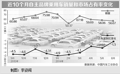 中国汽车工业协会7月9日发布数据显示,6月自主品牌乘用车销量为56.67万辆,环比下降2.41%,占乘用车销售总量36.23%,占有率比上月下降0.28个百分点,比上年同期下降1.30个百分点。截至2014年6月,自主品牌乘用车月度市场份额已连续10个月呈同比下降状态。
