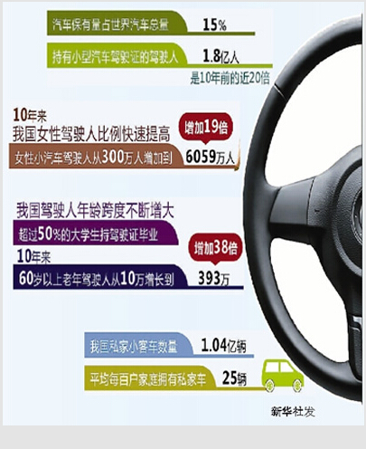 数据显示,我国民用机动车保有量已达2.64亿辆,其中汽车1.54亿辆,汽车数量仅次于美国居世界第二位。目前我国汽车保有量已占世界汽车总量的15%。持有小型汽车驾驶证的驾驶人达到了1.8亿人,是10年前的近20倍。