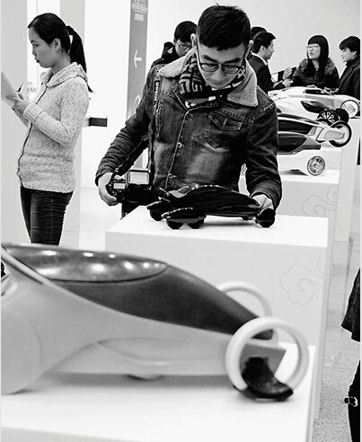1月31日,在首届中国青年环保汽车创意设计大赛决赛现场,观众在欣赏参赛作品。