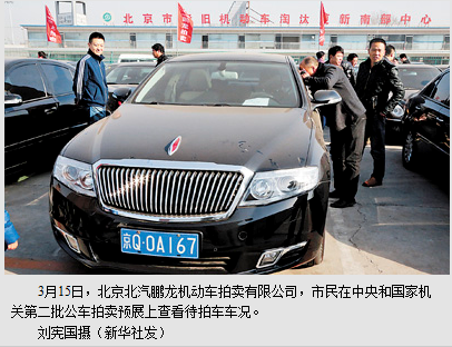 据了解,第二批拍卖将举办4场拍卖会,分别为:3月18日和3月30日,北京北汽鹏龙机动车拍卖有限公司专场;3月21日,北京花乡拍卖有限公司专场;3月28日,北京中拓国际拍卖有限公司专场。公车拍卖依然实行“车牌分离”,不会带牌拍卖。