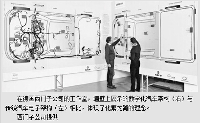 监控屏幕上,一辆汽车疾驰而行。突然,它的两个前轮一个左拐,一个右转——车身划了一道弧线,漂移到道路一侧。如此高难度的动作,车里却没有驾驶员——原来,这是慕尼黑的西门子中央研究院研究中心的一个汽车数字化操作系统模拟测试。将来这套系统将抛弃传统的机械动力装置,全部采用数字指令方式来操纵汽车的前进、后退、加速、刹车。西门子公司软件工程师科尔内尔·克莱恩博士对本报记者表示,电脑的出现,把打字机送进冷宫;数字操作系统的出现,可望给汽车行业带来颠覆性的革命。