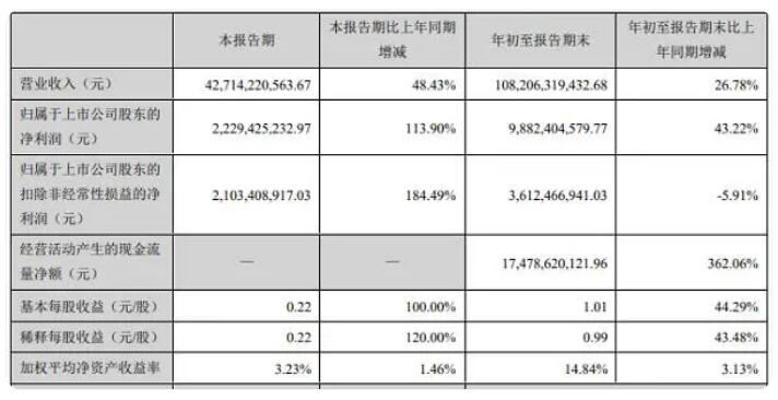 10月30日,重庆长安汽车有限公司发布财报显示,今年三季度,长安汽车营业收入427.14亿元,同比增长48.43%;归母净利润22.29亿元,同比增长113.9%;归属于上市公司股东的扣除非经常性损益的净利润为21.03亿元,同比增长184.49%。