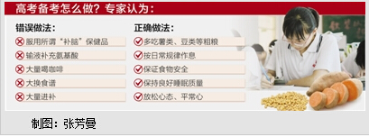 “补充营养、补充脑力不是短期能够提高的,短期突击没有意义。”范志红说,食物安全、睡眠质量良好,对于保证大脑高效运作更重要。最为关键的是高考要保持一颗平常心,让考生轻松迎考。