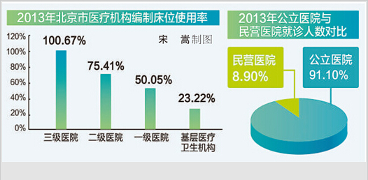 近年来,北京市社会办医疗机构发展较快。截至2013年底,全市民营医院374家,占全市医院总数57.8%;实有床位17845张,占全市总数的17.15%。诊疗人次数逐年增加,但相比公立医院占比仍然很低,2013年民营医院总诊疗人次1309.2万,仅占全市医院诊疗人次的8.9%。