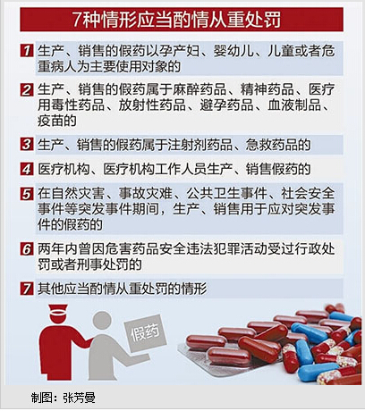 新的司法解释共有17条,明确了生产、销售假药、劣药应当酌情从重处罚的7种情形。同时,司法解释还明确了生产、销售假药罪“严重情节”“特别严重情节”的认定标准,确定了从危害后果、犯罪数额、假药种类、犯罪主体等多方面进行综合评判的原则。