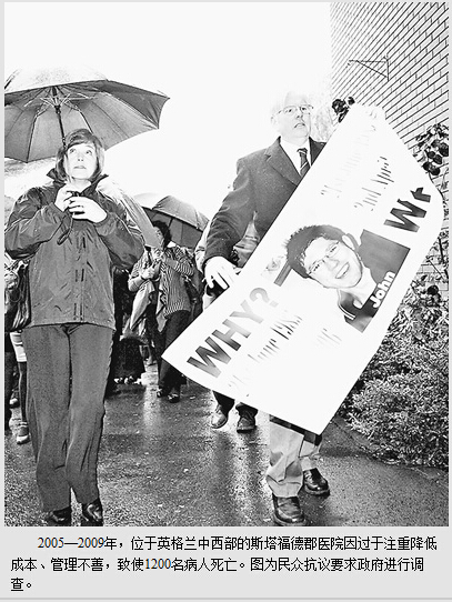 ▲2013年2月,英国政府公布调查报告称,斯塔福德郡医院在2005—2009年期间将削减开支、降低成本作为业绩目标,无视保护民众健康的基本责任,导致1200名病人死亡,成为NHS下属医院史上最大丑闻。英国首相卡梅伦在报告公布后,向病人及家属致歉,并称将采取行动弥补医疗体系漏洞。