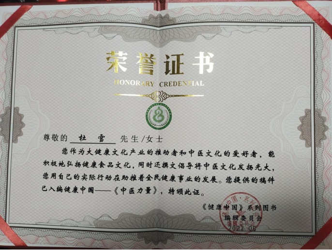 鉴于杜雪在“开展健康中国行动文化传播中,能够深入挖掘大健康产业文化内涵和时代价值,对推动健康中国行动在当地群众中的传播行为有促进作用”。于2022年8月30日,经《第1健康报道》通联部审核,授予杜雪为第1健康报道“健康宣传大使”荣誉称号。