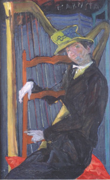 雕塑家莎利姆贝尼的作品《竖琴手》则是一副表现性绘画的代表作,画家运用鲜艳的色彩晕染画面,用人物的表情神态来表达自己的内心世界。画面运用强烈的表达暗示,从人物紧张的线条和躯体轮廓里可以表现出竖琴手正如痴如醉的陶醉在音乐中,情绪因动作的紧张而激动。这幅表现性绘画正是画家运用色彩的力量描绘着内心的强烈激情,给人留下难以磨灭的生命情感的印象,让观者为他笔底流露的情感所倾倒,从而表现出作者内心世界的精彩。