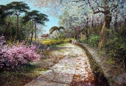 朝鲜从20世纪50年代开始发展绘画艺术,在中国绘画的基础上,经过半个多世纪的发展,形成了自己独特的风格:笔力挺拔,色彩艳丽,风格清雅。洪哲雄的《春天》就是朝鲜画风的代表。整幅画在着色时,尽量选取暖色调来达到光线明暗与风景色彩的协调,其间的小路让人们有一种惬意的感觉,路旁盛开的鲜花和葱郁的植物让人们有种想进入画中的冲动。